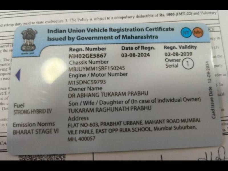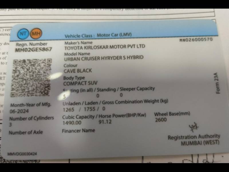 MH-02-GE-5867 2024/AUG TOYOTA URBAN CRUISER HYRYDER S HYBRID OWNER FIRST COLOUR BLACK FUEL PETROL HYBRID KEY'S (17650) KMS RUNNING INSURANCE VALID 12-07-2026 IMMACULATE CONCEPTION PRICE 17, 50, 000/-